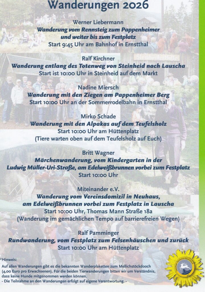 Vielmehr liegt es uns besonders am Herzen, den Kindern und Jugendlichen die Liebe zur heimatlichen Natur nahezubringen. So wird in bewährter Weise das Infomobil „Lernort Natur“ des Landesjagdverbandes Thüringen mit umfangreichen, anschaulichen Informationen aufwarten. Das Thüringer Forstamt Neuhaus am Rennweg reiht sich mit einer Naturerlebnis- Strecke ins Festgeschehen ein, bei der auch die Erwachsenen noch etwas lernen können.